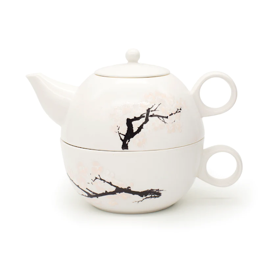 Deze porseleinen theepot met kopje is ontworpen om op elkaar gestapeld te worden. Vul de theepot en het kopje met heet water en zie langzaam de bloesem bloeien.